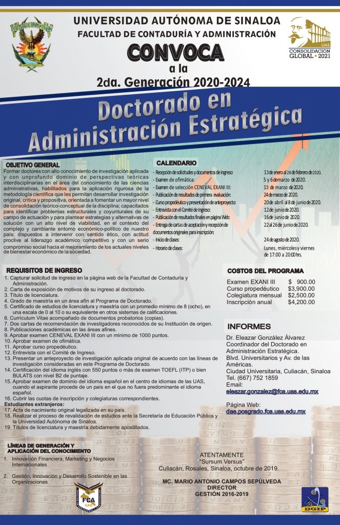 El Doctorado en Administración Estratégica (DAE), surge principalmente como instrumento para la atención a las necesidades sociales que tanto internacional, nacional y regionalmente están demandando en materia de investigación y competitividad empresarial, en ese sentido el objetivo del DAE es formar doctores con alto conocimiento de investigación aplicada y con un profundo dominio de perspectivas teóricas interdisciplinarias en el área del conocimiento de las ciencias administrativas, habilitados para la aplicación rigurosa de la metodología científica que les permitan desarrollar investigación original, crítica y propositiva, capacitados para identificar problemas estructurales y coyunturales de su campo de actuación y plantear estrategias y alternativas de solución a los complejos problemas de los organismos privados y públicos y que esto incida en la creación y desarrollo de nuevos diseños organizativos e institucionales; dispuestos a intervenir con sentido ético, y con un serio compromiso social hacia el mejoramiento de los actuales niveles de bienestar económico de la sociedad.